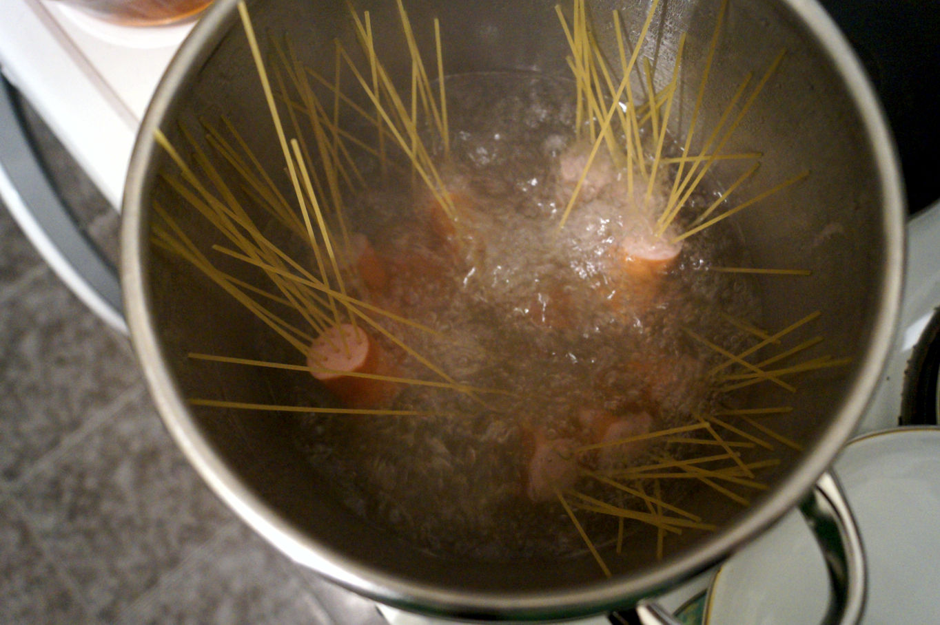 Вчера Милена реализира една идея, която видя в клипче във Фейсбук. Вместо да варите спагетите отделно, след което да ги смесвате със соса и кренвиршите, вие варите кренвиршите и спагетите заедно като едно цяло. Първо продупчвате парчетата кренвирш по следния начин: