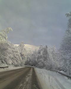 В крайпътно ресторантче хапнахме. Кучето остана в колата. Дърветата бяха величетвени, а снегът правеше гледката изключително красива: