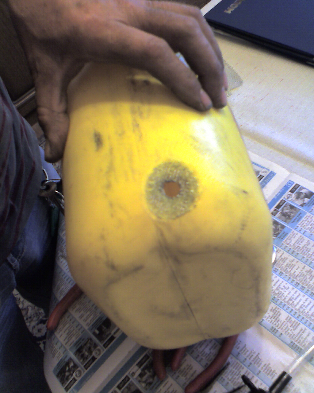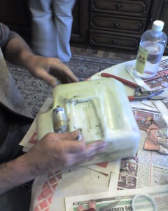 Почти се басирах, че няма как да стане. И добре, че не го направих, защото със сигурност щях да изгубя баса. Намерихме пет литрова туба на Шел. Баща ми проби дупка и я армира със същата мрежа: