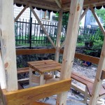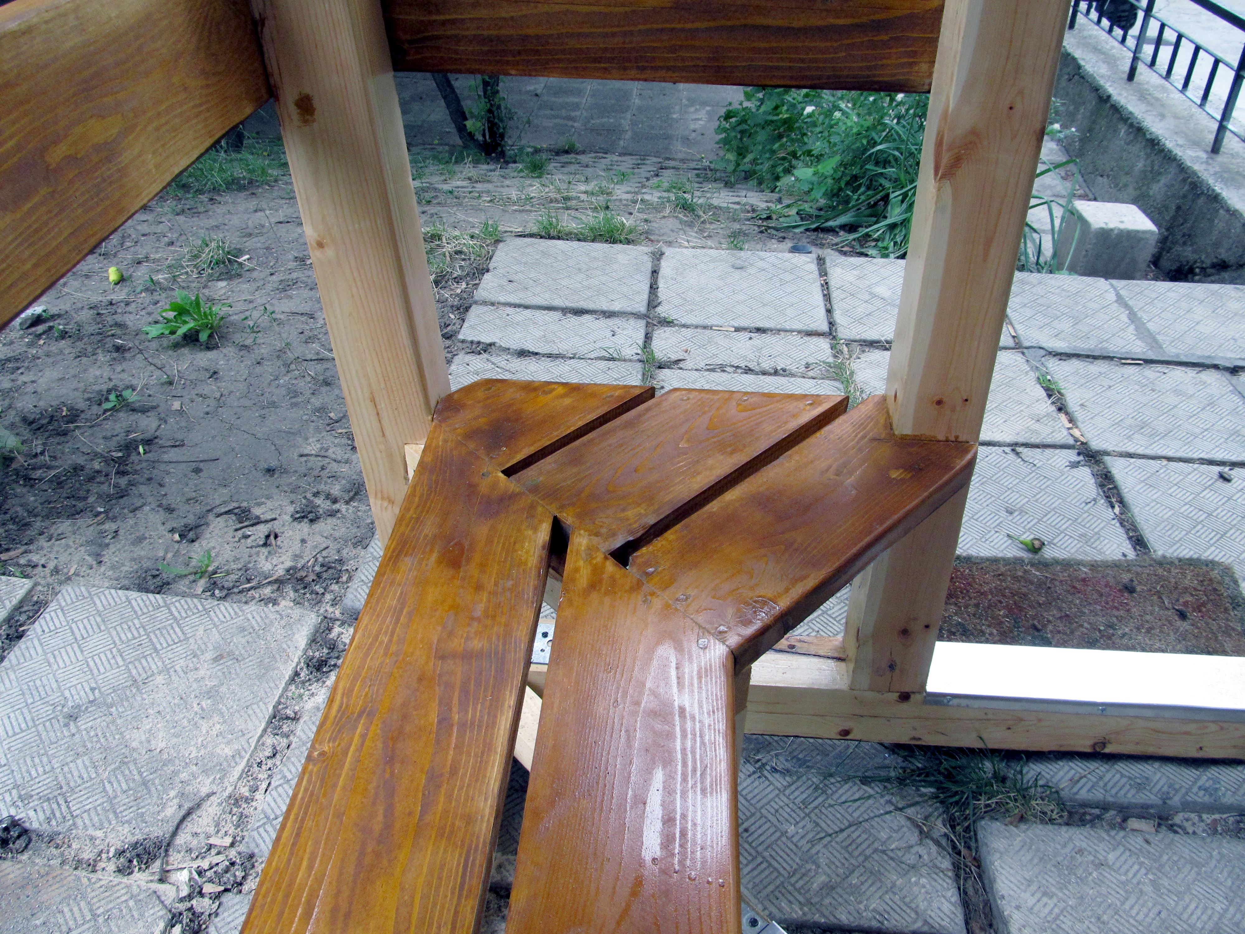 Основната конструкция беше планирана и изпълнена от строителен инженер, а аз се явявах чирак (носех дъски и пирони, лакирах и т.н.). Някои дребни детайли бяха и импровизация - например ъгловите пейки до входа бяха моя идея, масичката пък беше преправяна, плота в подпокривното пространство беше добавен допълнително и т.н. Горе покрихме с битумни керемиди (под тях грунд). Общо инвестицията за беседката излезе около 1000 лева (за материали само, труда ни беше безплатен). Конструкцията е подвижна (няма основи) и е в нормите под 2,20 метра (за да не се изисква разрешително за строеж според ЗУТ). В общи линии се получи много добре.